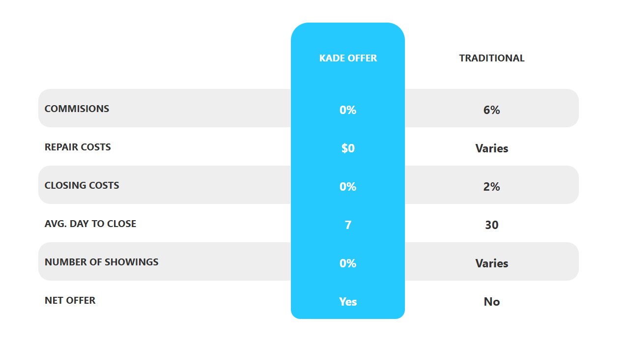 Traditional home sales can be time-consuming and complicated when you need quick relief. That’s where Kade Homes shines. We offer swift, cash-based solutions for properties like yours. Skip the hassle of renovations, open houses, or commissions; we purchase your home as-is, helping you move forward faster.
